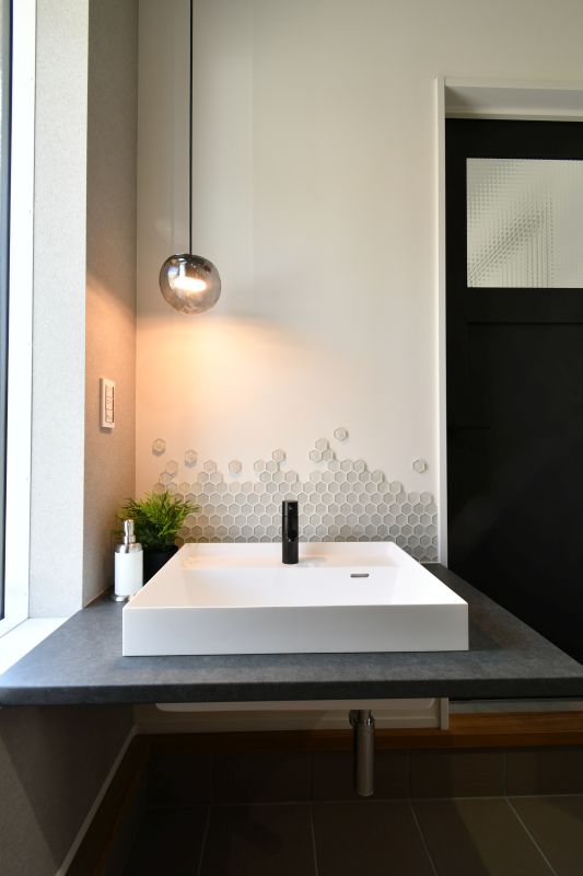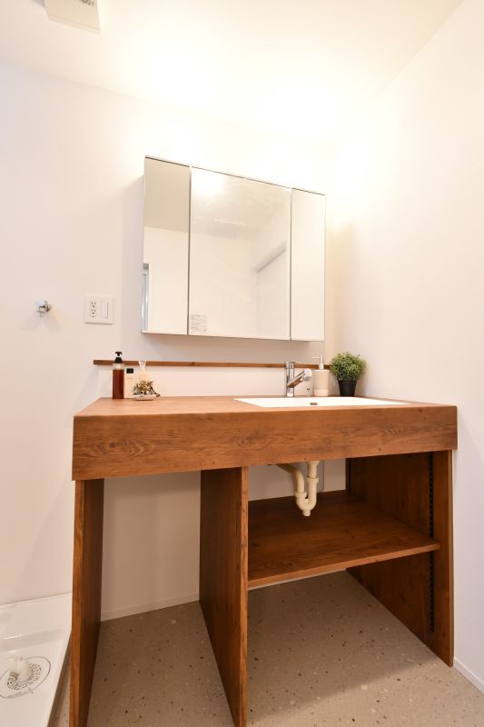 広々洗面室。造作カウンターに可動式窓枠造作鏡。