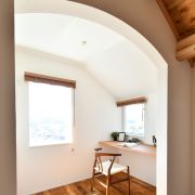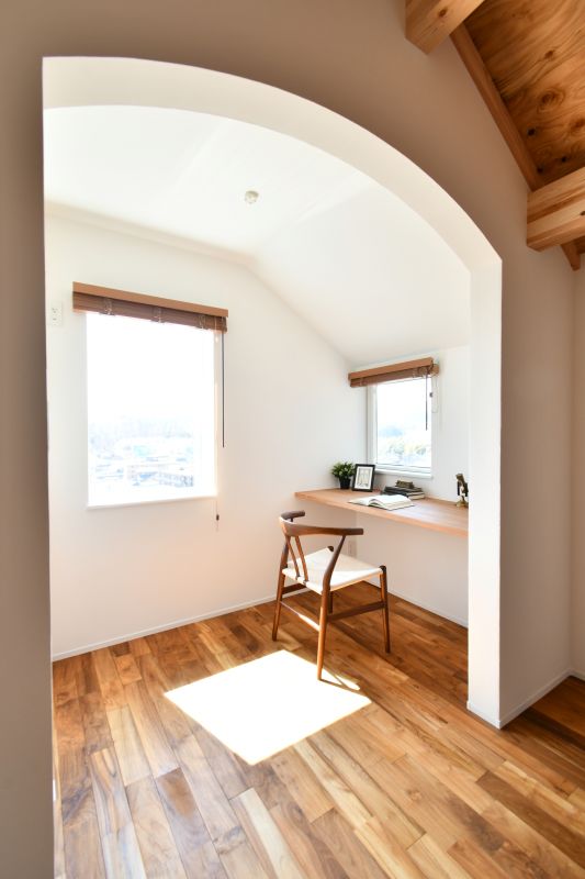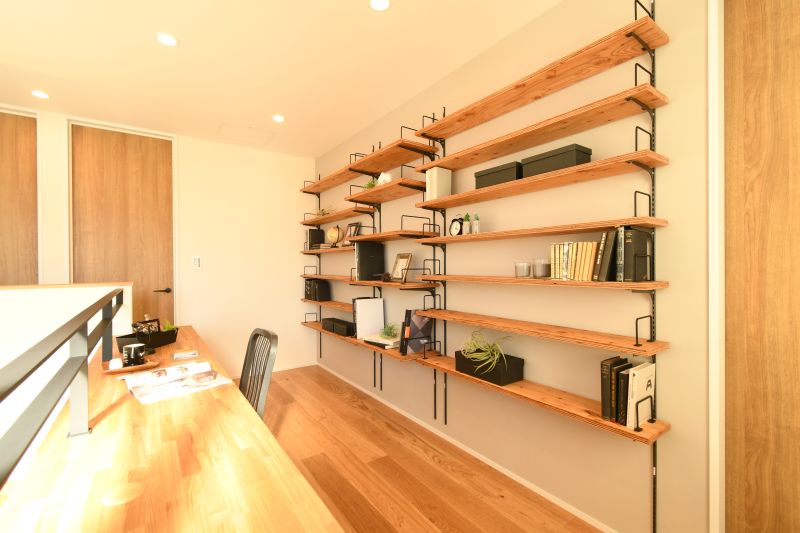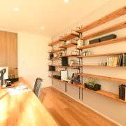 狭いスペースでも、造作の机と収納で広々した書斎に