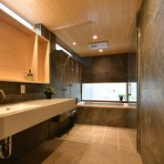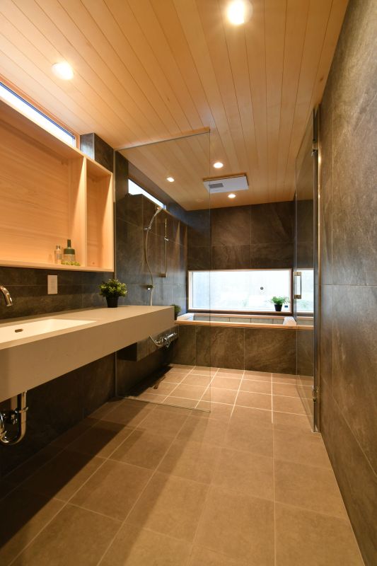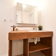 洗面スペースの壁・天井を木張り。造作洗面と一体化。