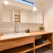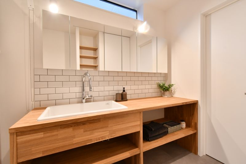 木の質感と白のタイルが映える、ナチュラルで清潔感のある洗面空間