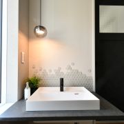 手洗い器・タイル装飾・ニッチ収納造作 バランスよく配置。