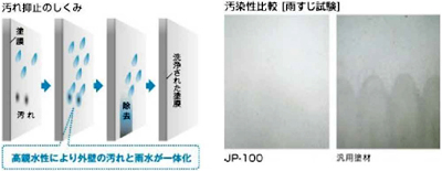 塗膜の汚れを、雨で流し落とします。塗膜が水になじみやすいので、汚れの付着を防ぎ、美観を長期間保ちます。